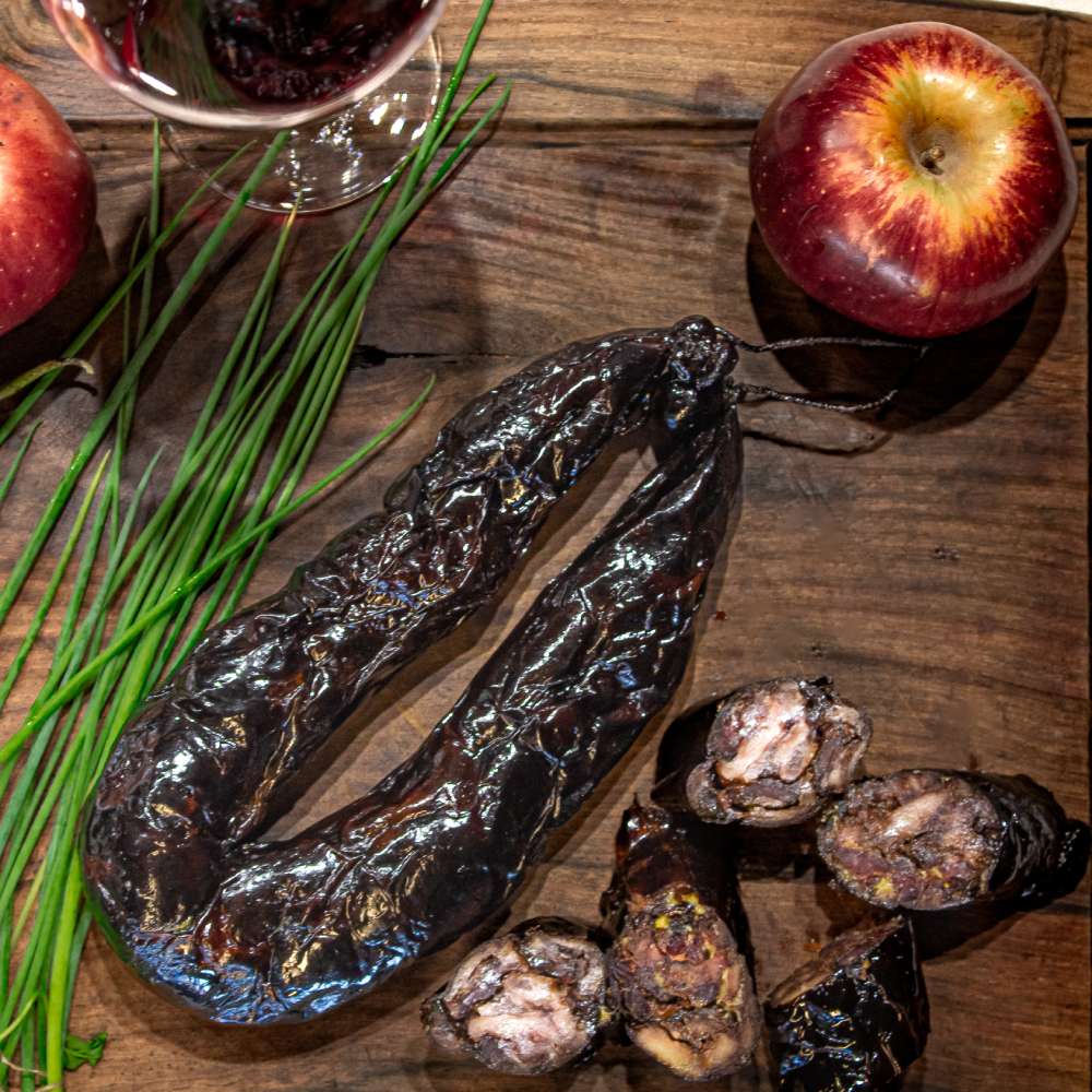 Enchido defumado com sangue e condimentos — um toque intenso à sua receita.